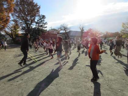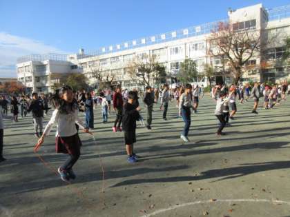 校庭は日差しが出ていてぽかぽかです。今日の体育朝会は4年生から6年生の短縄跳びです。曲に合わせて基本的な技に取り組みました。
