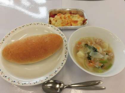 【献立】セサミパン・マカロニグラタン・ベーコンと野菜のスープ煮・牛乳