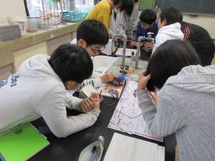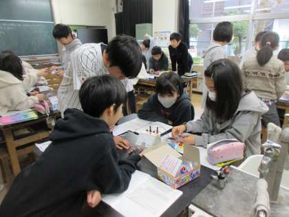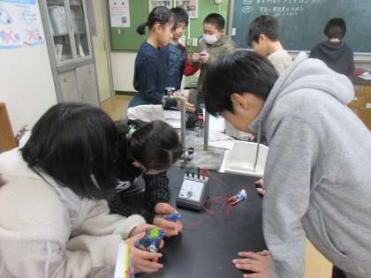 今日は発光ダイオードやモーターなど、電気を使用するものによって電気の使用量の違いを電流計を調べて実験をしていました。班の友達と話し合い試行錯誤しながら、自分たちで回路を作り、実験を進めていました。