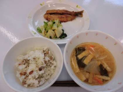 【献立】炒り大豆ごはん・いわしの蒲焼き・こまつなのおひたし・みそ汁・牛乳