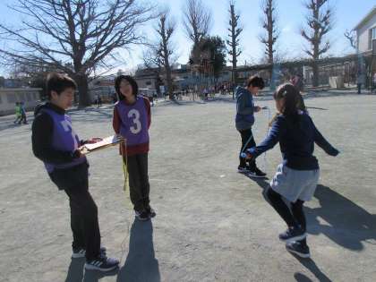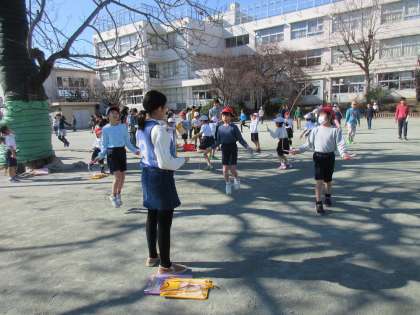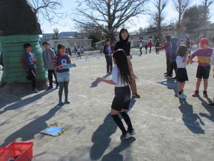 あたたかな日差しが降り注ぐ中休み。桐の木の下ではなわとび検定が行われました。今日の挑戦は2年生。検定員は6年生です。