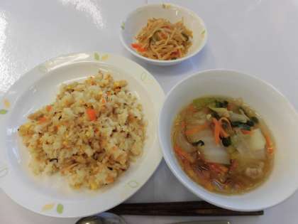 【献立】そぼろごはん・もやしのコチュジャンかけ・白菜と春雨のスープ・牛乳