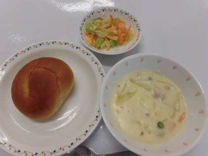 【献立】黒砂糖パン・クリームシチュー・パリパリサラダ・牛乳