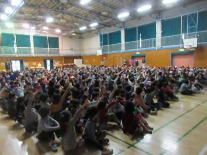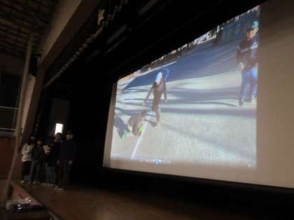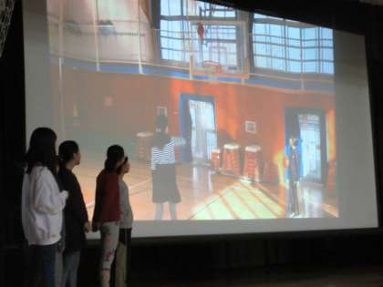 今日の集会は動画を使ったクイズです。トライした人はだれか、○○さんの決まったシュートはいくつかといったように。子どもたちは集会委員が作った動画を食い入るように見ていて、正解だった子どもたちは歓声を上げていました。