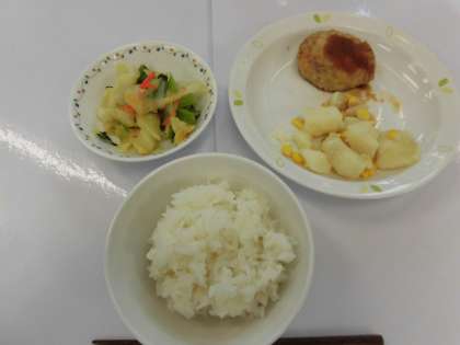 【献立】ごはん・豆腐入りハンバーグ・和風ソース・コーンポテト・おひたし