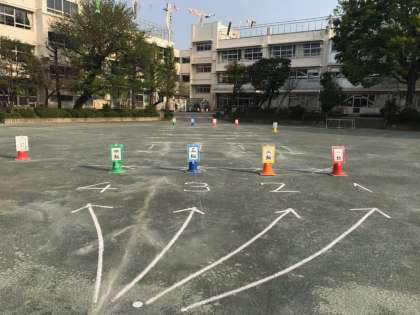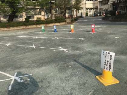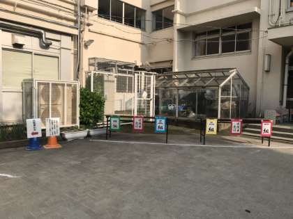 クラスごとの列が設定されています。並んでいる前の方との距離が確保されていますので、目印に従って移動してください。長机がありますので、お子さんのクラスの表示の所で受け取ってください。1年生の保護者の方は、就学通知書をご提出ください。受け取ったら、徒歩の方は右へ、自転車の方は左へお進みください。感染拡大防止のために、ご協力をよろしくお願いいたします。