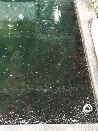 にまいめのしゃしんは、しょくいんしつまえの、いけのおたまじゃくしです。よくかんさつしてみると、あしがはえています。このあとどうなるのか、たのしみです。