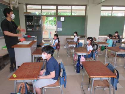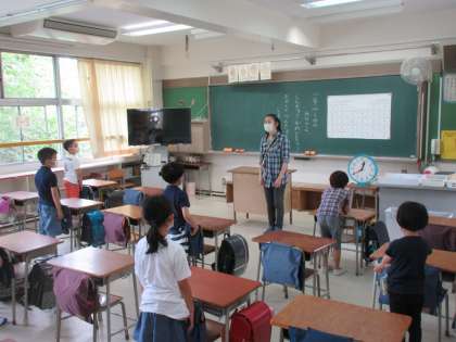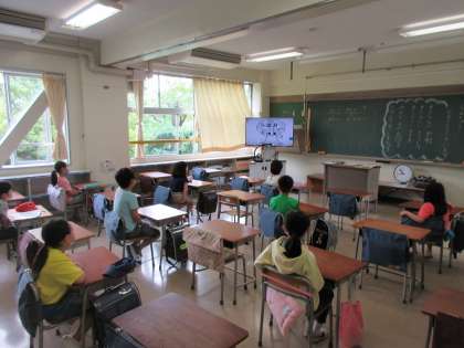 2年生の様子です。初めての入室でやや緊張気味ですが、先生の話をしっかりと聞いていました。また、学校での新しい生活の仕方について、大型テレビに映し出された動画を見ながら学んでいました。1年生の時と比べると成長を感じる初日です。
