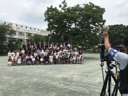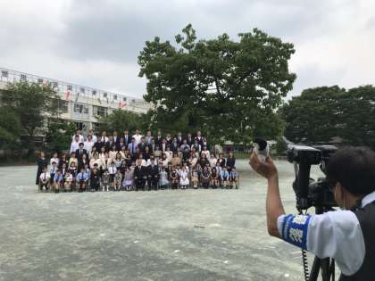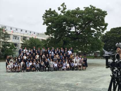 校庭の桐の木の下で、記念写真を撮影しました。いろいろなものが飛び出して、みんなニッコリ。