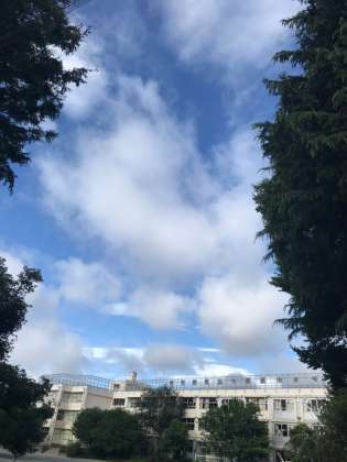 あさは、しゃしんのようなあおぞらがみえましたが、いまはくもっています。かぜがつよいですね。しょくいんしつのつくえのうえは、すなでざらざらしています。