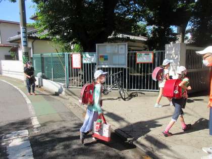 今日は4年生と5年生の登校日です。正門では校長と生活指導主任の槙本先生で子どもたちを迎えています。