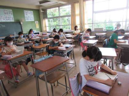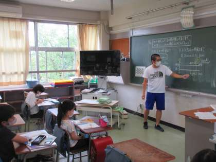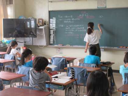 1組は算数の小数のかけ算。高学年の算数で大切な数直線を使っていました。2組の算数は講師の先生が授業をします。3組は理科。真剣な学習態度はさすが高学年です。