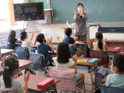 2年生の音楽は講師の先生の授業です。音楽に合わせて手拍子で3拍子のリズムをとっていました。歌や鍵盤ハーモニカができませんが先生が工夫して教えています。