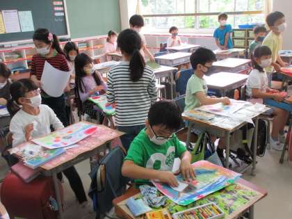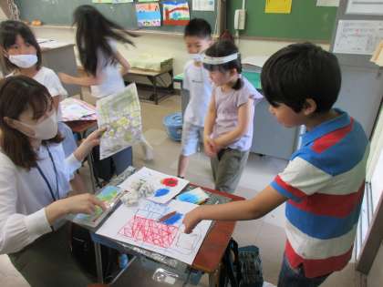 図工はクレヨンでお絵かき。塗った色をこすってぼかしを入れるなど楽しく、のびのびを絵を描いていました。