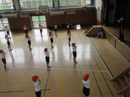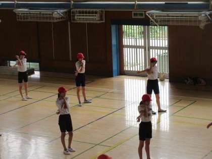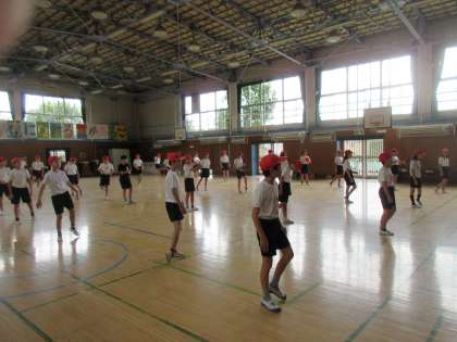 体育館で6年生が体育の学習をしていました。体育は子どもたちの健康面を配慮してマスクを外して学習をします。