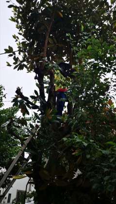 大きなはしごを木に立てかけ、高いところまで登り、剪定(せんてい)をしています。
