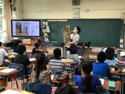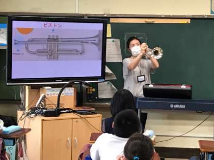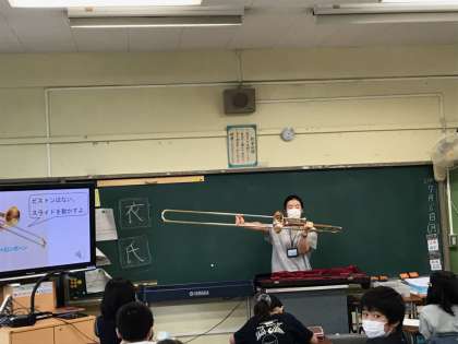 今週は金管楽器の登場です。本当は3年生の授業で行う予定でしたが、休校でのびのびになっていました。今日は、トランペットとトロンボーン、ユーフォニウムの3種類の実物が登場。形や音の高さ、演奏の仕方の違いを学びました。