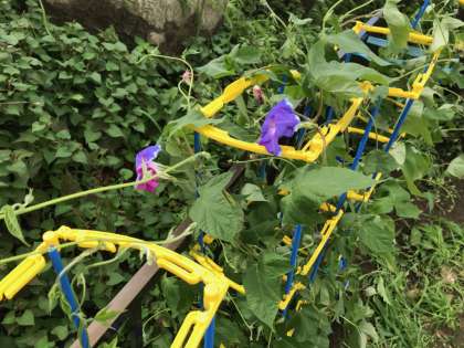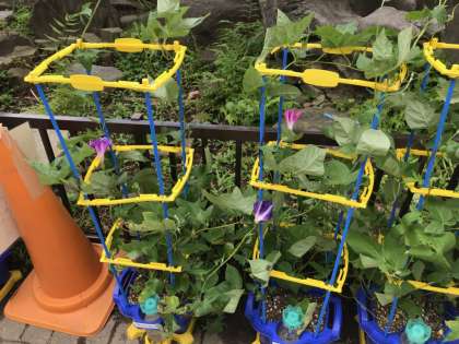 1年生のアサガオです。お家で育てた時期があったのが理由なのか、花の咲き始めに違いがあるようです。いずれにしても、見頃はこれからですね。