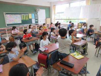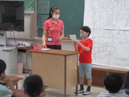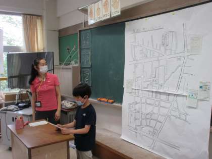 教室の黒板には大きな街の白地図。子どもたちは自分のお気に入りの場所を発表し、カードを地図に貼り付けていました。理由を聞くと「なるほど」と思うことがあり、自分たちの街なのに新しい発見がありました。みんなで楽しい発表ができました。