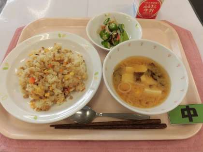 【献立】そぼろごはん・オクラともやしのひたし・みそ汁・牛乳