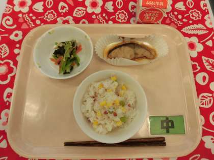 【献立】夏の香りごはん・稲田のみそ照り焼き・こまつなのおひたし・牛乳