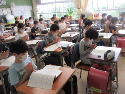 5年生の教室から音楽と手拍子が聞こえてきました。譜面を見ながら曲に合わせて手拍子でリズムを取っていました。2つのパートがあり、合わせるとちょっとした合奏になります。