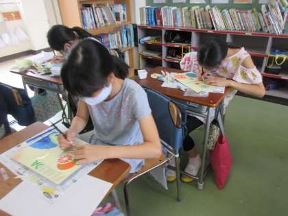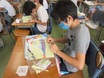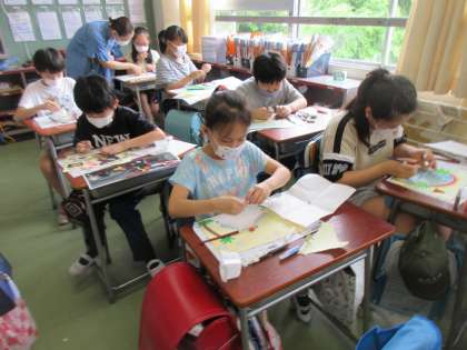 5年生が図工で砂絵に取り組んでいました。いろとりどりの砂を画用紙の上にふりかけ、指や筆で砂を広げていきます。色の濃淡を付けたり、グラデーションにしたりと砂を特性をよく生かしていて、素敵な作品が出来上がっています。