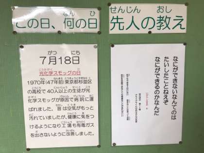 今日は何の日の掲示と、有名人?の言葉です。光化学スモッグ。今でも注意報が発令される日がありますが、私が小学生の頃は、大変だった記憶があります。ぼのぼのはコミックですが、テレビアニメにもなっています。土曜日の早朝の5分間の放送です。ご存知の方はいらっしゃいますか?