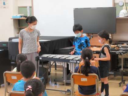 3年生はたくさんの楽器に囲まれた音楽室の雰囲気に少々テンションが上がり気味でした。今日はいろいろな打楽器の紹介。実際にたたいてみたりしました。