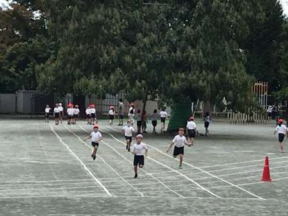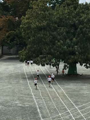 今日は昨日までとは違って、曇り空です。短距離走の練習をしています。