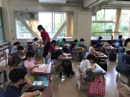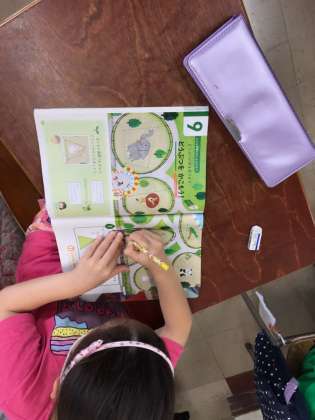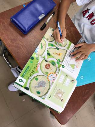 三角形と四角形の学習の導入で、点と点を直線で結んで動物を囲んでいます。
