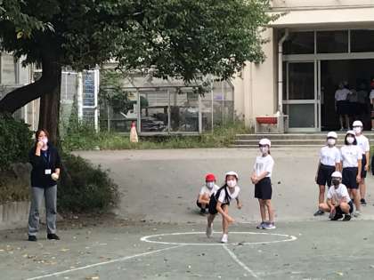 反復横跳び、長座体前屈、握力など、今年は可能な限り、記録を計測しています。写真は校庭でのソフトボール投げの様子です。