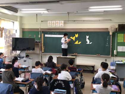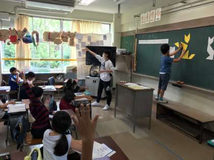 実習3日目。実習生のU先生の算数の授業です。タングラムでいろいろな形を作る学習です。
