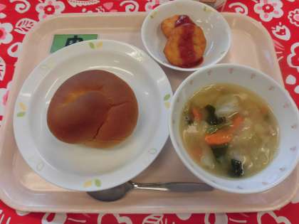 【献立】黒砂糖パン・豆腐ナゲット・白いんげんの田舎風スープ・牛乳