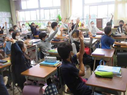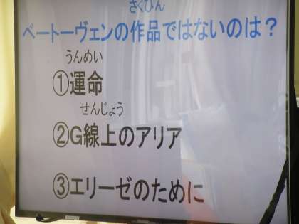 音楽の先生が放送室からベートーベンにちなんだクイズを出したり、ベートーベンの曲を話したり。いつもとは違う音楽朝会ですが、子どもたちが楽しめるように工夫しています。