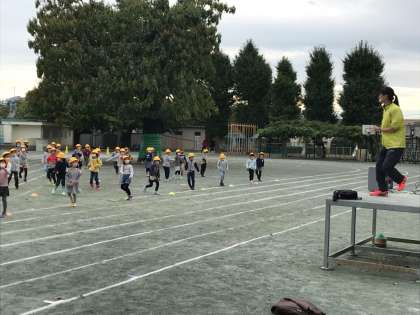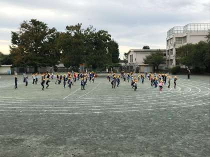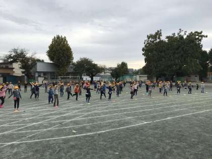 この後、芋掘りに出かけるので、普段着に黄色い帽子で踊っています。流れる曲は学園天国。余談ですが、私が小学校4年生の時の大ヒット曲です。