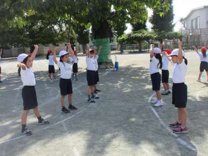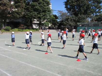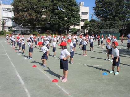 1年生は「学園天国」に曲に乗って、元気いっぱいのノリノリのダンスです。本番ではボンボンを持って踊ります。