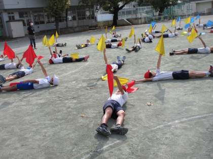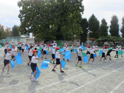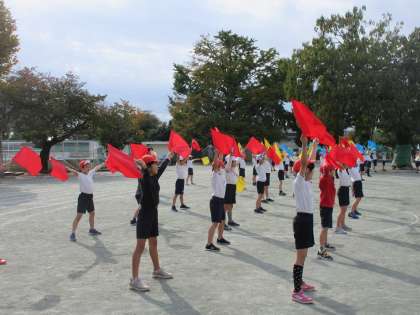 クラスごとに4色の旗を振りながら、音楽に合わせて元気いっぱいに踊っていました。