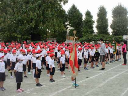 午前の部(1,3,5年)の校庭での開会式の練習の様子です。6年生は開閉会式のどちらにも参加します。4学年が集うのは初めてですが、しっかりと行動することができています。