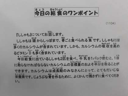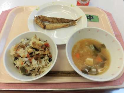 【献立】豆入りひじきごはん・ししゃものから揚げ・キャベツのみそ汁・牛乳