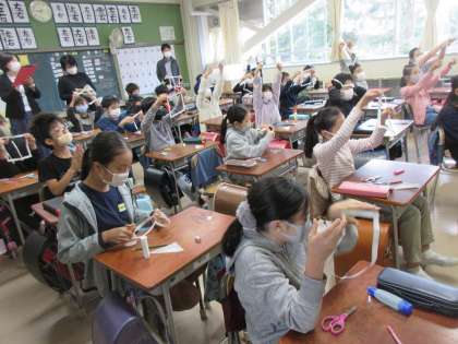 4年生の担任の教員が算数の四角形の発展学習の授業をしました。2つの同じ大きさの帯を輪にして垂直につなぎ合わせ、帯の中央をはさみで切るとなんとを正方形になります。その理由を考える授業でした。子どもたちは今まで学習したことと関連させ、その理由を一生懸命考えていました。