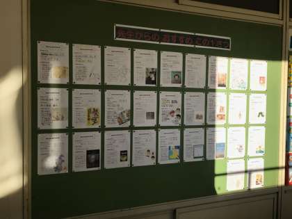 読書旬間にちなんで、図書室前に先生方のお勧めの本が掲示されています。