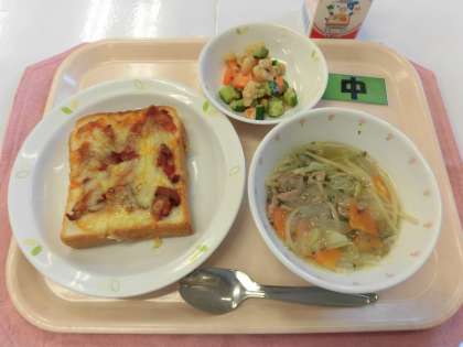 【献立】ピザトースト・ビーンズサラダ・ヌードルスープ・牛乳