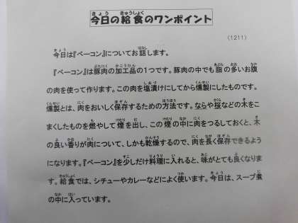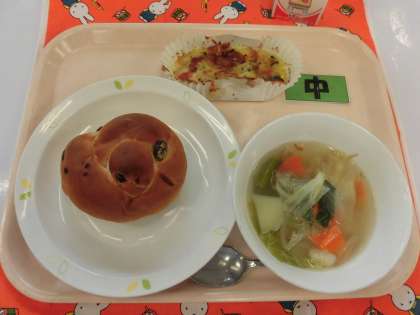 【献立】ぶどうパン・魚のマヨネーズ焼き・ベーコンと野菜スープ煮・牛乳