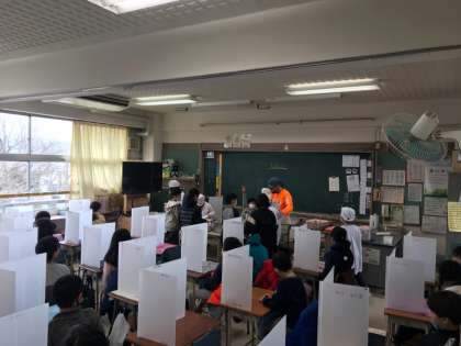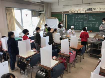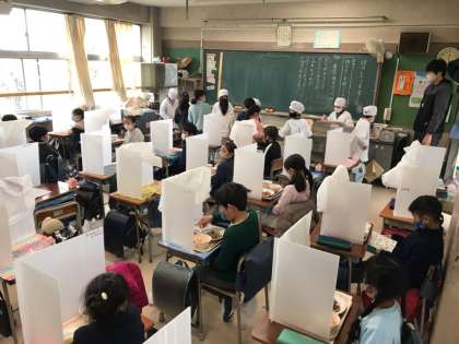 久しぶりの給食です。感染拡大を防ぐために、お互いに注意を払いながら、準備をしています。写真は3年生の教室の様子です。