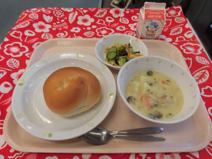 【献立】ミルクパン・クラムチャウダー・わかめサラダ・牛乳