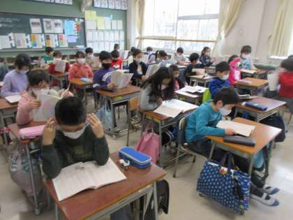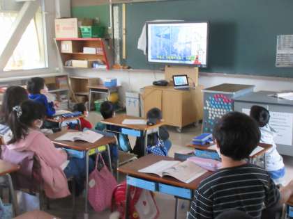 3年生が百人一首の学習。視聴覚教材や教科書を使って短歌の響きやリズムを感じながら学習していました。