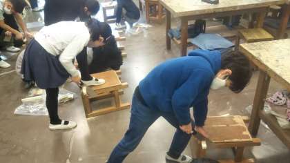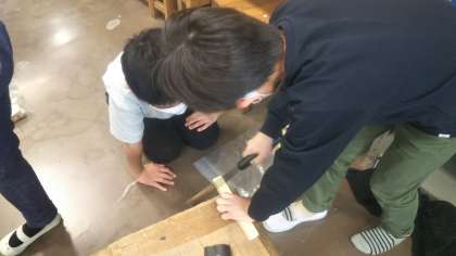 のこぎりを使って、角材を切っています。協力しながら、学習を進めています。このあと、切った角材をくぎでつないで作品作りをしていきます。どんな作品に仕上がるのか楽しみです。