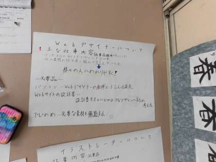 総合ではキャリア教育として「未来をえがく」で自分の興味ある職業について調べ学習をしています。調べたことを発表するため、模造紙に書いてまとめる子やパワーポイントを使ってまとめる子など、発表の仕方は様々ですが未来を思いえがきながら取り組んでいます。