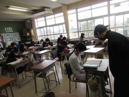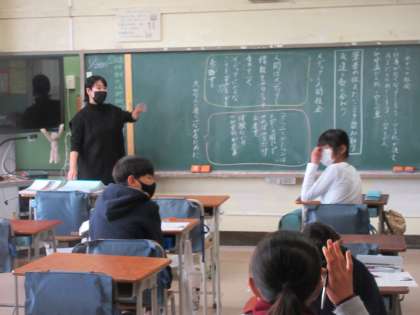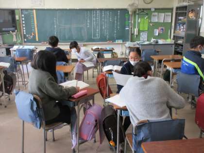友だちと分担して作品を読んで、要旨や感想を伝え合いながら学習を進めていました。友達や先生との残り少ない学校生活を大切にしながら学習していることが感じられる授業でした。